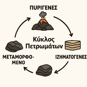 Τα πετρώματα αποτελούνται από ένα ή περισσότερα ορυκτά και ταξινομούνται σε τρεις βασικές κατηγορίες: πυριγενή, ιζηματογενή και μεταμορφωμένα. Τα πυριγενή προκύπτουν από την ψύξη και στερεοποίηση του μάγματος (π.χ. γρανίτης), τα ιζηματογενή σχηματίζονται από τη συσσώρευση και συμπίεση ιζημάτων (π.χ. ψαμμίτης), ενώ τα μεταμορφωμένα προκύπτουν από την επίδραση υψηλής πίεσης και θερμότητας σε ήδη υπάρχοντα πετρώματα (π.χ. σχιστόλιθος). [32] Ο κύκλος των πετρωμάτων περιγράφει τη συνεχή ανακύκλωση των πετρωμάτων μέσω διεργασιών διάβρωσης, απόθεσης και μεταμόρφωσης, που διαρκεί εκατομμύρια χρόνια και συμβάλλει στη διαμόρφωση της γεωλογικής δομής της Γης[33].
